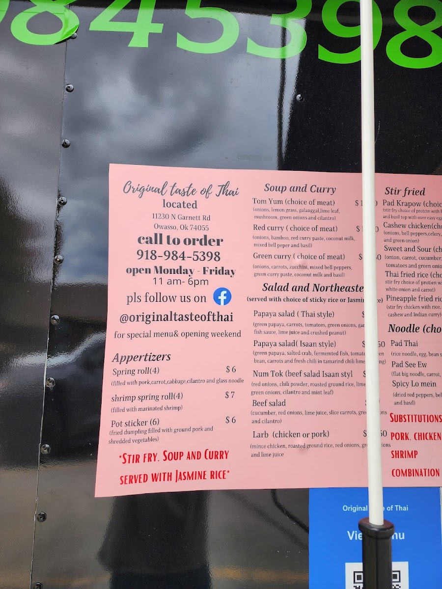 Welcome to the "Original Taste of Thai," a gem nestled at 1700 Old River Rd, Tahlequah, OK. This food truck has quickly become a local favorite, renowned for its vibrant and authentic Thai flavors. Patrons rave about the freshness of the ingredients, with highlights including their delightful Pad Thai, aromatic green curry, and crispy spring rolls. The welcoming atmosphere created by the friendly staff adds to the experience, making every visit memorable. Customers have praised the cleanliness of the kitchen, underscoring the commitment to quality. Whether you're craving potstickers or Nam Tok, "Original Taste of Thai" promises a delicious journey through Thailand right in your neighborhood.